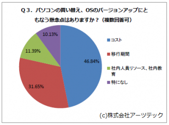 Windows XPのサポート終了後の対策として、[パソコンの買い替え、OSのバージョンアップにともなう懸念点はありますか?(複数回答可)]と質問したところ、半数以上が『コスト』『移行期間』が懸念点であると回答した。