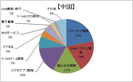 中国は基幹系システムや情報系システムなどソフトウェア開発案件が割合として一番多く、次いでWebシステム開発や組み込み系開発となっております。逆にスマホアプリ開発やFacebookアプリ開発など、単発では小規模に値する案件の割合は少なくなりました。