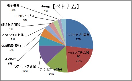 ベトナム人は真面目で親日で、中国よりも人件費が安いということで、最近では特に人気を集めており、スマホアプリはもちろんながらコンシューマ向けのWebシステム開発やFacebookアプリなどもアウトソースする企業が増えております。