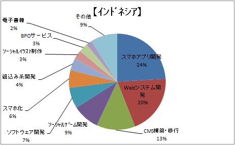 インドネシアでもベトナム同様スマホアプリ開発が一番人気となりました。またWebシステム開発やCMS構築・移行などの案件にも人気が集中しました。他国と比べインドネシアは比較的どの案件ジャンルにも対応でき、ベトナムと同様バランスの取れた結果となりました。