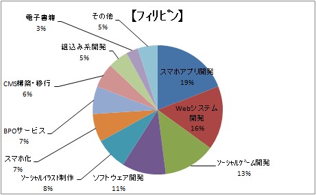 フィリピンオフショア開発で特徴的なのが、コンシューマ向け案件が集中していることです。右図ではスマホアプリ開発やWebシステム開発、ソーシャルゲーム開発などが人気ですが、ソーシャルイラスト制作の割合も比較的高く、デザインを海外へアウトソースする流れも今後増加していくのではないかと考えられます。