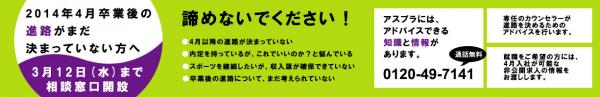 体育会学生の就職支援・採用支援を行う株式会社アスリートプランニング(本社:東京都新宿区高田馬場3-12-2/代表:山崎秀人)は、2014年3月卒業が確定している上で、卒業後の進路が決まっていない体育会学生を対象とした『4月入社◆緊急相談ダイヤル』を3月5日(水)~3月12日(水)の期間限定で設置いたします。