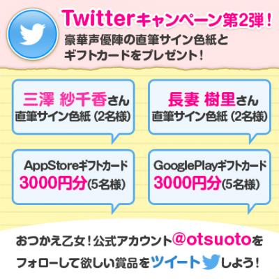 公式アカウント『@otsuoto』をフォローして指定の文言をツイートした方に、三澤紗千香さんと長妻樹里さんの直筆サイン色紙を各2名様に、Google Playギフトカード3000円分とApp Storeギフトカード3000円分を各5名様にプレゼントします。