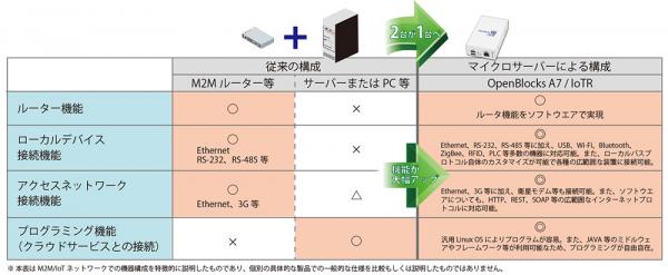 IoTルーターエディションのマイクロサーバーである「OpenBlocks A7/IoTR」を使用することにより、システム構築の際に機器を削減でき、機器構成がシンプルになり、システム管理のコストも削減できます。