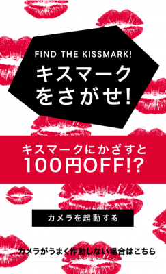 ジーユーアプリを立ち上げて、キャンペーン時期に配布しているショッピングバッグや店員が着用しているキャンペーンTシャツ、店内告知物などにある「キスマークモチーフ」にカメラをかざすと、抽選で100円オフクーポンが当たります。
