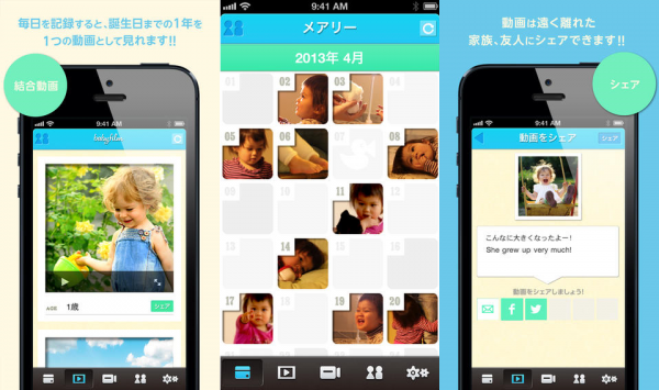 撮影するだけで、写真では残せない、声、仕草を残せると共に、お子さんの成長の変化をアルバムの様に動画で見る事ができます。