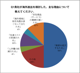 最初の質問は、「海外進出を検討した主な理由」について。海外進出の目的として、主なものは、「(1)コストダウンを狙った製造拠点」「(2)販路拡大先の市場」の2つが挙げられるかと思います。今回の調査でも、そうした目的が回答を二分するかと予測していましたが、結果は少し違っておりました。