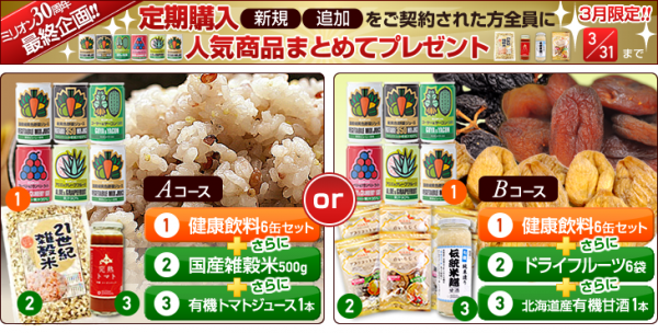 無臭ニンニク健康補助食品として28年のロングセラー商品「ミリオンパワー」、そして健康に配慮した「ミリオン健康飲料シリーズ」などを販売するミリオン株式会社(埼玉県さいたま市)は、3月4日~3月31日までの間に、健康飲料等の対象商品を「定期購入」で新規お申込みされた方を対象に、まとめてプレゼントキャンペーンを実施中です。この機会に、ミリオンのお得な定期購入をご利用下さい。