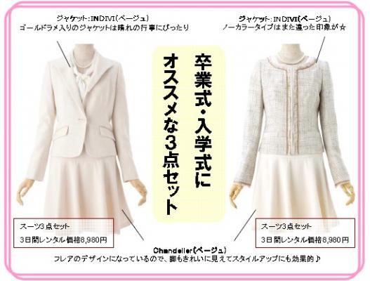 ジャケット、スカート、アクセサリーの3点を最短3日間8,980円でレンタルできるお得なセットです。