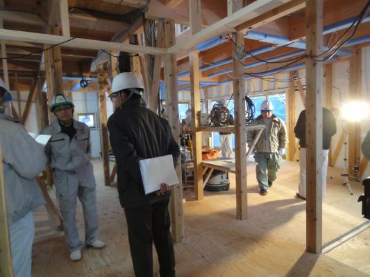 現場では、それぞれの現場の大工、現場監督がいろいろな質問を受けて対応しておりました。そして会議室では寿ホームズ株式会社の新規入場者教育の資料をもとに、何故現場をきれいにするのか、何故安全を徹底的におこなうのかなどについてお話しいただくとともに、“これが寿ホームズの現場です”を写真などであらわした「現場スタンダード」の説明もしていただきました。そして大工の代表にも、これまでの取り組みで苦労したことなどをお話しいただきました。