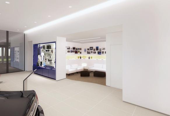 ショールームのデザインは、最新のマセラティCIを全て導入。洗練された白とブルーを基調に、ラグジュアリースポーツブランドにふさわしいエレガントな雰囲気を提供。大きなガラス張りのスペースが、明るい開放感とくつろぎを演出します。