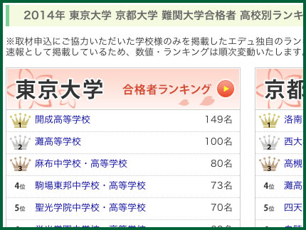 その他、京大や早慶上理、ICU、東工大などのランキングも掲載しており、その高校別の2014年度の結果を知ることができます。