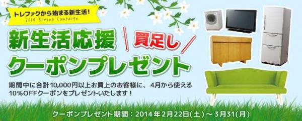 リユースショップの運営を行う株式会社トレジャー・ファクトリーは、2014年2月22日(土)から3月31日(月)の期間中、総合リユースショップ「トレジャーファクトリー」各店舗にて、合計金額10,000円以上お買い上げいただいたお客様に、4月から使える10%OFFクーポンをプレゼントする「新生活応援キャンペーン」を実施しています。