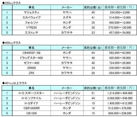 20142月度のオークネットバイクオークションにおける成約台数を集計し、排気量別ランキングベスト5をまとめました。