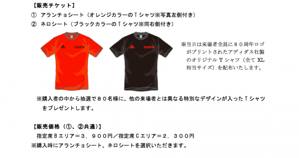 今回、同サービスで購入いただくチケットでは、配布されるTシャツの色をお選びいただける他、巨人軍80周年を記念して、購入者から抽選で80名様に試合当日、ジャイアンツグッズをプレゼントします。また、購入者は、東京ドームでジャイアンツの選手が守備位置に付く際にオーロラビジョンで放映している特別映像「GIANTS PRIDE」をスマートフォンでご覧いただくことができます。
