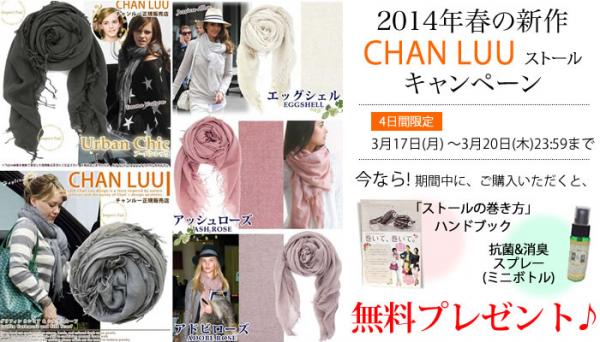 入学、入社など、これから新生活を迎えるあなたに、新しい環境でもがんばってほしい!という願いを込めて、チャンルーストールをご購入いただくと、巻き方ひとつで装い変わる「ストールの巻き方ハンドブック」と、なにかと便利な「抗菌消臭スプレー(ミニボトル)」を無料プレゼントするキャンペーンを3月17日(月)朝9:00~3月20日(木)23:59までの4日間限定で行います。