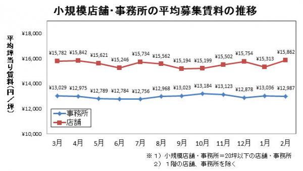 小規模店舗(20坪以下)の平均募集賃料は、2月に前月比3.6%上昇していますが、2012年の秋以降、1.5 万円台をキープしています。