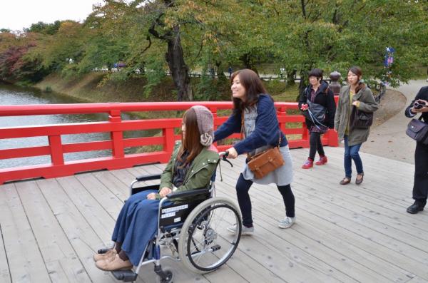 弘前公園では、弘前さくらまつり期間中、公園内で車いすの貸し出しと、車いすの介助をするボランティア「車いす応援隊」が常駐しています。