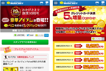 会員500万人突破を記念して、クレジットカード決済キャンペーンを実施致します。5,000円以上決済のお客様に、付与モブGを5%増量致します!