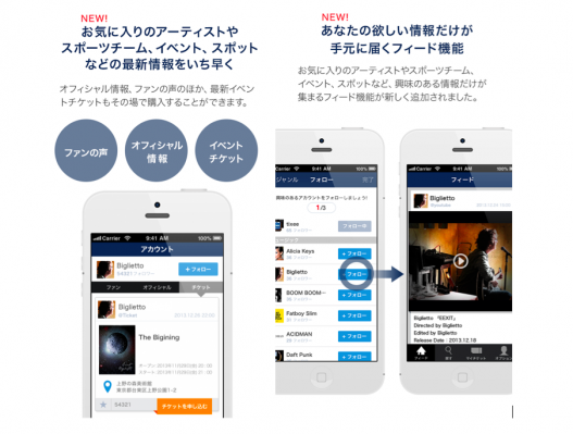お気に入りのアーティストやスポーツチーム、イベント、スポットなど、 ユーザーが興味のある情報だけが集まるフィード機能を新しく追加致しました。 最新情報をいち早く入手でき、オフィシャル情報、ファンの声のほか、最新イベントチケットもその場でアプリ内購入することができます。