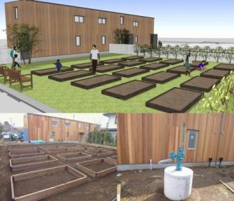 “ハナミズキ菜園”は、「子どもを見守り育む」をコンセプトにオープンした木の外壁が印象的なテラスハウスのまち“ハナミズキ”に隣接し、コミュニティハウス、ゲストハウスとともに一体開発され、あたらしいコミュニティの形成を目指しています。