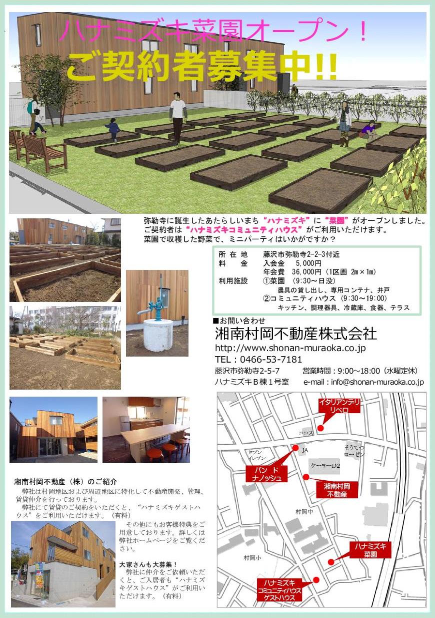 湘南村岡不動産株式会社(神奈川県藤沢市弥勒寺2-5-7ハナミズキB棟1号室 代表取締役 早坂浩治)は、藤沢市弥勒寺において開設する“ハナミズキ菜園”の利用募集を2014年3月19日より開始いたしました。