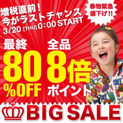 ベビー・キッズ服ブランドBABYDOLL(ベビードール)が、通販サイト各店にて[増税前のラストチャンス!全力応援イベント]を3/20(木)深夜0時より開催!最終80%OFF、全品8倍ポイントなど盛り沢山