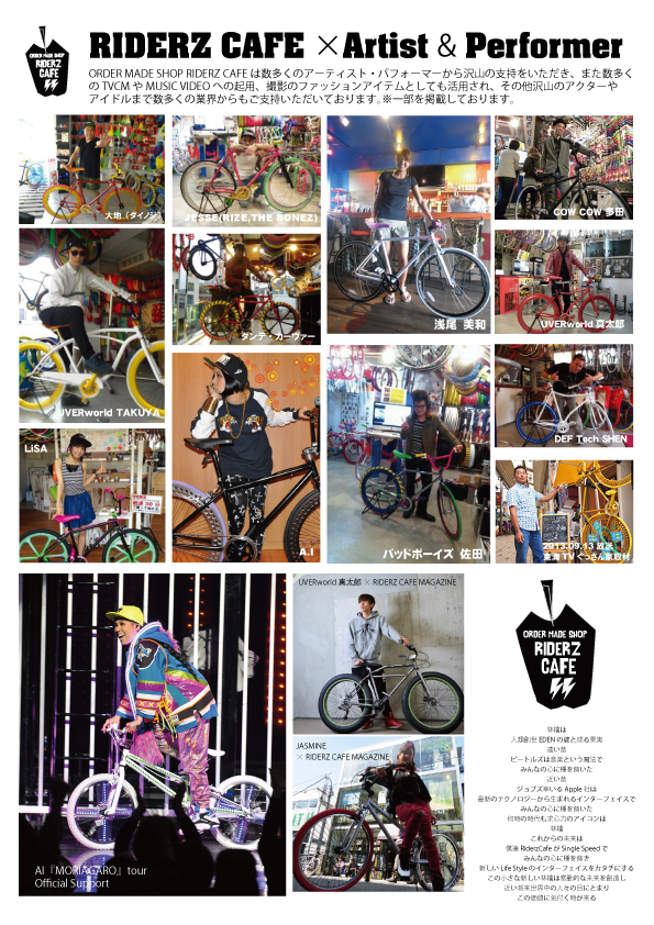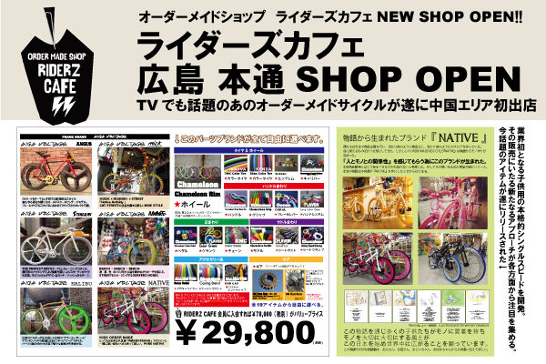 東京 原宿キャットストリートで話題のオーダーメイドショップライダーズカフェ(運営:福岡市東区三苫3-1-3株式会社ライダーズカフェ)が遂に中国エリア初出店。 数多くの著名人が愛用する事やCM・TV番組・ファッション誌・MUSIC PVでもファッションアイテムとして起用される事も多いオーダーメイドブランドSINGLE SPEED。昨年のAI『MORIAGARO』ツアーではBMXが大きくフューチャされており多くの話題を呼んだ。 オーダーメイドの組み合わせも14京通りを越えて、先日朝の情報番組(全国ネット)に出演した際に司会者の方に『これは凄い。組み合わせの数が半端じゃない。世界に一台に自分だけのオリジナル自転車が作れるじゃないか!!しかもカッコいい!!』と言わしめCM中に乗り回していたほど。(放映当日YAHOO!トピックスにも掲載された) 現在、東京 原宿SHOPをはじめ、名古屋 大須SHOP、大阪 アメ村SHOP、広島 本通SHOP、福岡 大名SHOP、熊本 上通 並木坂SHOP(4月5日同時OPEN)と全国のブルーオーシャンカルチャーラインを構築すべく 全国6 店舗を展開しておりユーザー数も販売開始から5年間で5万台を突破、有料会員数も遂に1万人を突破。 2014年からファッション業界や小売業界に新たなる風を吹かす新たなるアプローチとして、KIDSブランド『NATIVE』をはじめカタログに商品のブランドがどんな想いや願いで生まれたか、そのストーリーを表面化するカタログを作成し各業界で話題となる。2014年は数多くのアーティストとのコラボの話も決定しており、話題に事欠かないオーダーメイドショップ ライダーズカフェが遂に熊本初出店。 ネットでも話題となっているライダーズカフェだが、通販は一切行わず、SHOPで“フィッテイング”というLIVEを楽しみながら自転車をオーダーメイドする『LIVE感』を大切にしている。(お客様の最大の楽しみにはSHOPにてオーダーメイドを楽しむ事。) 会員限定として29,800円のスペシャルパッケージを用意しておりますので、SHOPで是非オーダーメイド体験してください。