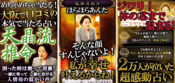 メチャメチャ当たる!大阪心斎橋で人気を博し、人情の母としてうたわれる人気鑑定士「天晶礼乃」。2万人が涙した一緒に笑って一緒に泣ける人情占は心の中にじわっと染み渡り、心底癒される言葉は自然と涙さえ流れます。厳しくも温かい、母の声をあなたもお聞き下さい。