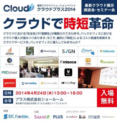 本イベントは、最新のクラウドサービスを提供するベンチャー企業が一堂に集い、大企業・中小企業の販売促進や企画を担う広告代理店やクラウドサービス導入を推進している中小企業に向けた商談やセミナー、懇親の場を提供します。また最新のオフィス空間を提案するプラスのショールームで開催することにより、ハード(オフィス家具、インテリアデザインなど)とソフト(クラウドサービス)両面からの、経営や事業推進のスピードアップ・効率化に関する提案を体感いただきます。