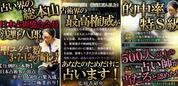 あなたは本当の占いを知っていますか?占い界の総本山……日本占術協会会長「浅野八郎」。300冊を超える著書、名立たる著名人の直接鑑定、1万人以上の個人鑑定、数々のテレビ出演。あの経営者も、有名マンガ家も、野球選手や映画監督も……500人以上の占い師が「当たる」と認め、頂点極めた的中占いを忠実に再現いたしました。日本最高峰と呼ばれる占いをその目で確かめて下さい。
