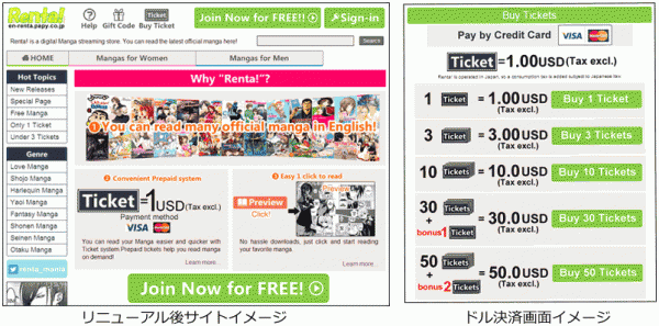 この度、「電子貸本Renta!」(英語版)では、海外ユーザの利便性を考慮し、電子書籍の購入に必要なプリペイドチケットの販売を、クレジットカードでのドル決済に対応致しました。ユーザは、お持ちのクレジットカード(*1)で、「電子貸本Renta!」で利用できるチケットを、1チケット1ドル(税抜)で購入頂けます。