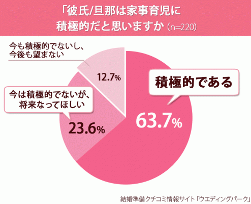 『彼氏/旦那は家事育児に積極的だと思いますか(単一選択)』という質問に、「積極的である」と回答した人は63.7%で6割以上の女性が自分のパートナーを「イクメン」と思っている事がわかりました。また「今は積極的でないが、将来なってほしい(23.6%」も合わせると8割以上が「家事育児に積極的な男性(イクメン)」を求めていることがわかりました。