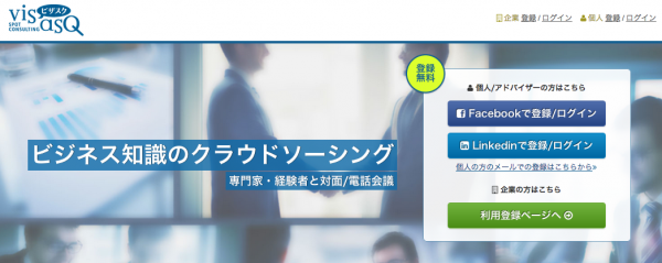 当社の運営する「ビザスク」( URL:https://service.visasq.com )は、事業企画や新規事業をはじめとするビジネスのあらゆる課題解決に、社内の知見だけでなく、業界業務の経験豊富な個人のビジネスナレッジを活用出来るよう、1時間単位の対面/電話会議をマッチングするビジネス知識のクラウドソーシングサービスです。