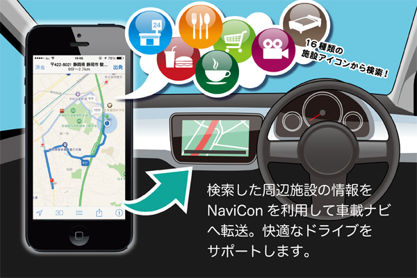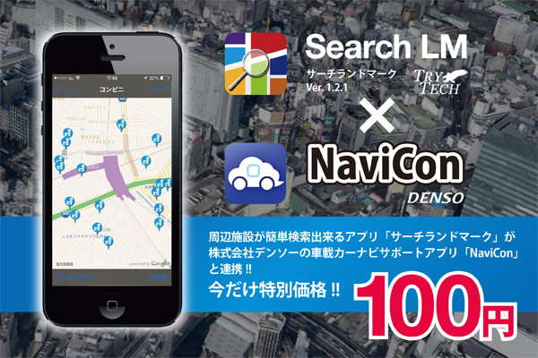 2014年03月10日にリリースした「サーチランドマーク1.2.1」におきまして、株式会社デンソーの車載カーナビサポートアプリ「NaviCon」と連携しました。「NaviCon」対応の車載ナビと連携する事で、より利便性が高くなりました。