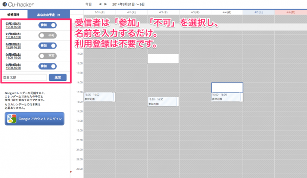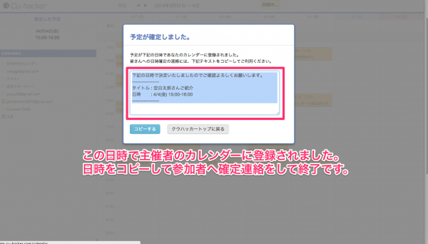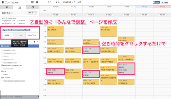 会議や打合せを主催したいCu-hackerユーザーが、Cu-hacker上から適当な日時をクリックし選択すると、自動的にみんなで調整用URLが生成されます。