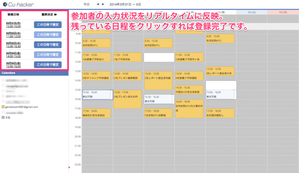 Cu-hackerは、それらの問題を直感的かつクリックのみで完了出来るようにしました。これにより、スケジュール調整にかかる手間とミスを限りなくゼロにすることを目指しております。