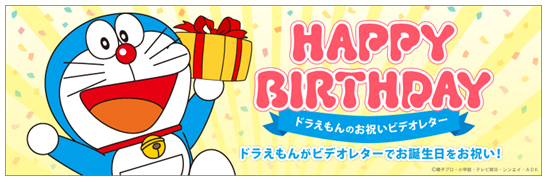 ドラえもんのお誕生日ソング「ハッピー☆ラッキー・バースデー!」に合わせて、ドラえもんやのび太くんたちが誕生日のお祝いをするビデオレターサービスです。オリジナル映像に写真とメッセージを入れ、世界にひとつだけの動画を作ることができます。作成したビデオレターはDVDに収めて、オリジナルパッケージでお届けします。