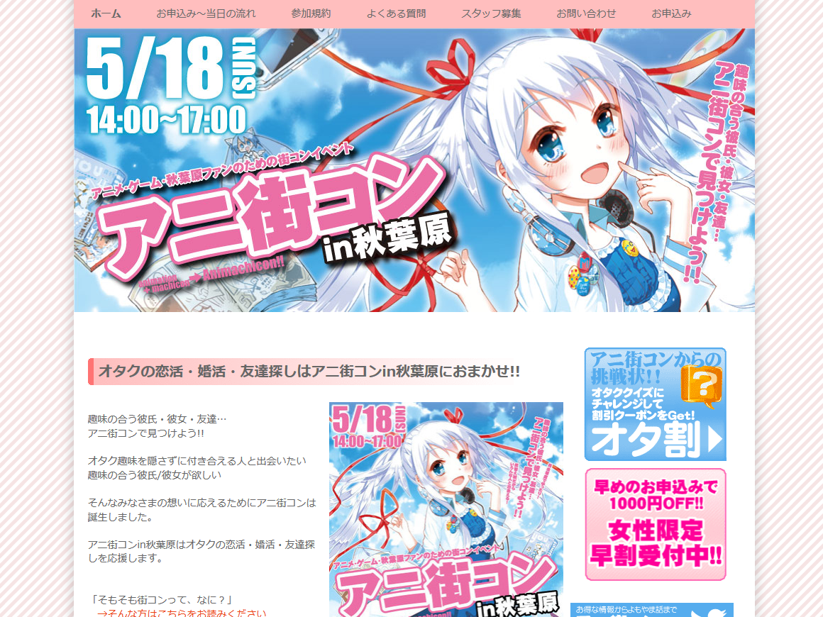 アニ街コン実行委員会は、2014年5月18日(日)に東京都千代田区のJR秋葉原駅周辺において