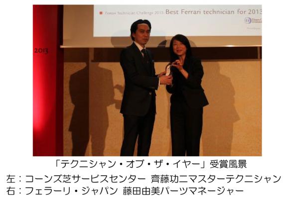 このうち最も優れたディーラーに与えられる「ディーラー・オブ・ザ・イヤー」の栄冠は「コーンズ栄ショールーム(フェラーリ名古屋)」が受賞。また、今回「テクニシャン・オブ・ザ・イヤー」を受賞したメカニックの齋藤功二(コーンズ芝サービスセンター)は、全世界のメカニックからNo.1を選出する「フェラーリ・テクニシャンチャレンジ2013」でも世界一に輝いており、世界と国内でダブル受賞を果たしました。