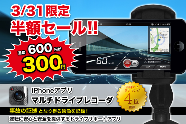 株式会社 恭和(本社:静岡県静岡市、代表:太田則明)は、株式会社トライテック(本社:静岡県静岡市、代表:太田則 明)と共同開発・販売しているiPhone用多機能ドライブレコーダーアプリ「マルチドライブレコーダ」の一日限定半額 セールを、2014年3月31日(月)に開催します。