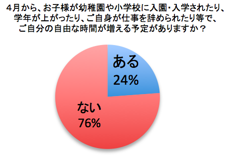 4月はいろいろな節目の時期ですが、子どもの入園や入学などで自分の自由な時間が増える予定のある方は全体の24%となり、およそ4人に1人の方が、4月から何かしら自由に使える時間が発生するという結果となりました。