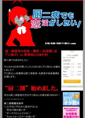 (有)アルスノバが運営するアニ街コン実行委員会では、アニメ・マンガ・ゲームファンのための街コン「アニ街コンin秋葉原」( 5/18(日)開催 http://www.animachicon.jp/ )を対象として、厨二病患者は参加費が無料となるキャンペーン、"厨二割"を4/1限定で開始しました。