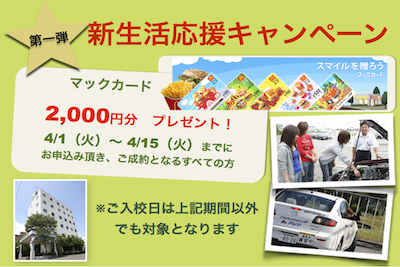 『合宿免許タッチドライブ』は、電話不要でスマートフォンからのみの申込みで合宿免許の予約が完結出来るサービスです。そのタッチドライブで期間中にお申込み頂き、ご成約頂いた方全員に、「新生活応援キャンペーン」と題してマックカード2,000円分をプレゼント致します。