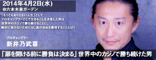 株式会社ネットスケット(所在地:埼玉県上尾市、代表取締役:芥川武)が主催するイベントシリーズ「ひとじく」では、プロギャンブラーの新井乃武喜(あらいのぶき)氏をお迎えし、来る4月2日(水)に講演会を六本木泉ガーデンタワーで開催いたします。