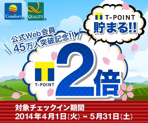 宿泊特化型ホテルブランド「コンフォートホテル」を展開する株式会社チョイスホテルズジャパン(本社:東京都中央区、代表取締役社長:村木雄哉、以下 チョイスホテルズジャパン)では、公式Webサイト(http://www.choice-hotels.jp)の会員制度「チョイスゲストプログラム」の会員数が45万人を突破したことを記念して、公式Webサイトからご予約し、4月1日(火)から5月31日(土)までの期間中にチェックインされたお客様に、Tポイントを2倍付与するキャンペーンを実施いたします。
