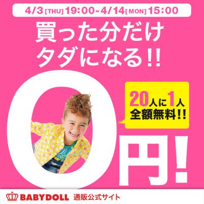 株式会社コージィコーポレーションが運営するベビー・キッズ服ブランドBABYDOLL(ベビードール)が、通販公式サイトにて[買った分だけタダになる!]BIGイベントを4/3(木)19時~4/14(月)15時まで開催します。通販公式サイト限定で20人に1人お買い物が0円になる、ベビド初のBIGイベントとなっております。
