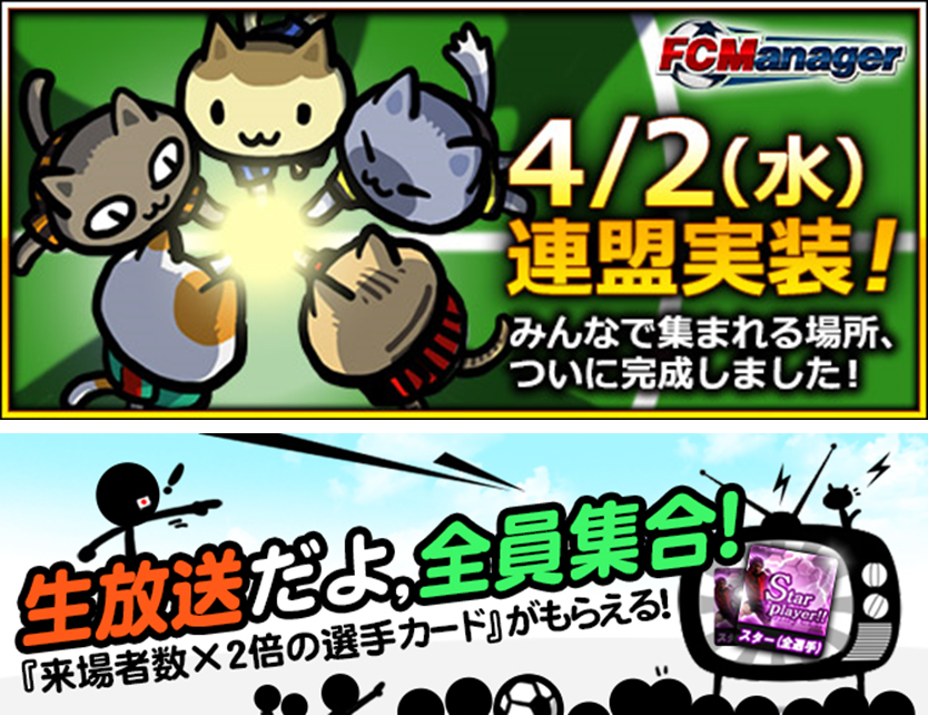 本日4月2日(水)、待望の『連盟』システムを実装します。これまでソロ活動中心だった『FCマネージャー』に、“ギルド”にあたる『連盟』システムが登場します。