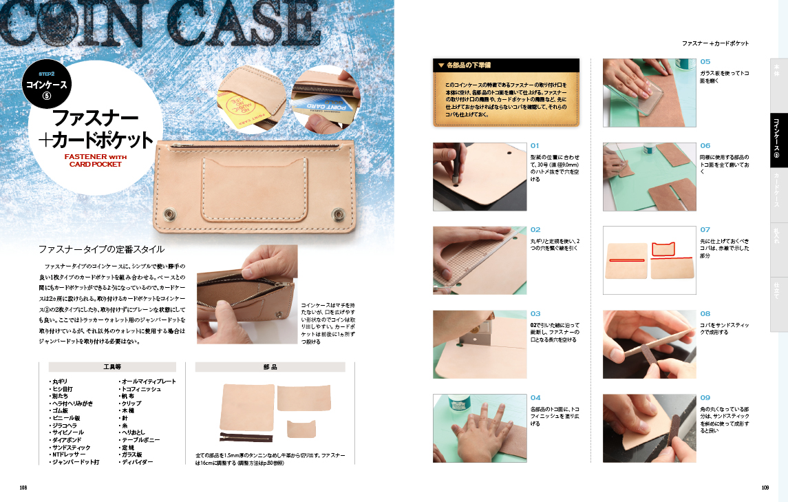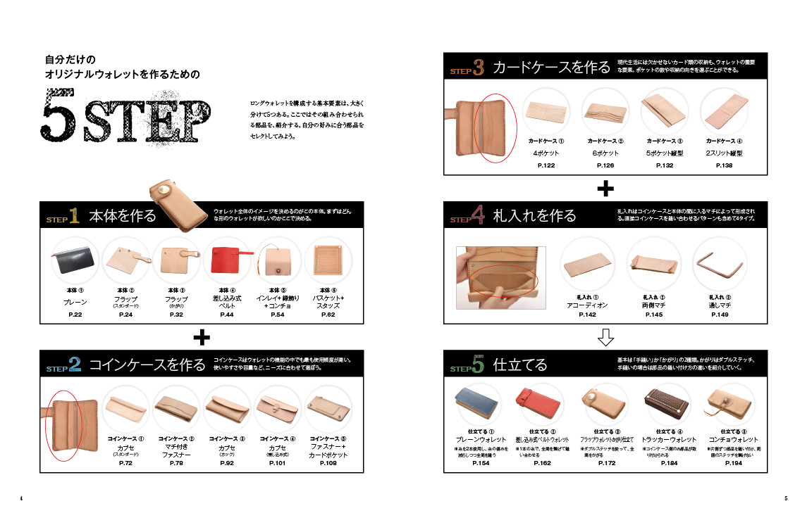 レザークラフトで制作するアイテムの中で、非常に高い人気を誇るのがロングウォレットです。本書では、ロングウォレットを構成する部品の規格を統一し、好みの部品を組み合わせられるようにしました。本体5種類、コインケース5種類、カードケース4種類、札入れ4種類(※マチ無し含む)を組み合わせることで、300通りを越える組み合わせのロングウォレットを作り出すことができます。また、コインケースとカードケースの左右の入れ替えや、カードケースを両側に取り付けたビルフォードなど、アイデア次第で更に作れるアイテムの幅は広がります。