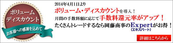 岡藤商事のインターネット商品先物取引「Expert(エキスパート)」の『ボリューム・ディスカウント』制度は、月末のお預かり残高に関係なく、月間の手数料合計額に応じて、手数料の還元率がアップする方式を採用しております。
